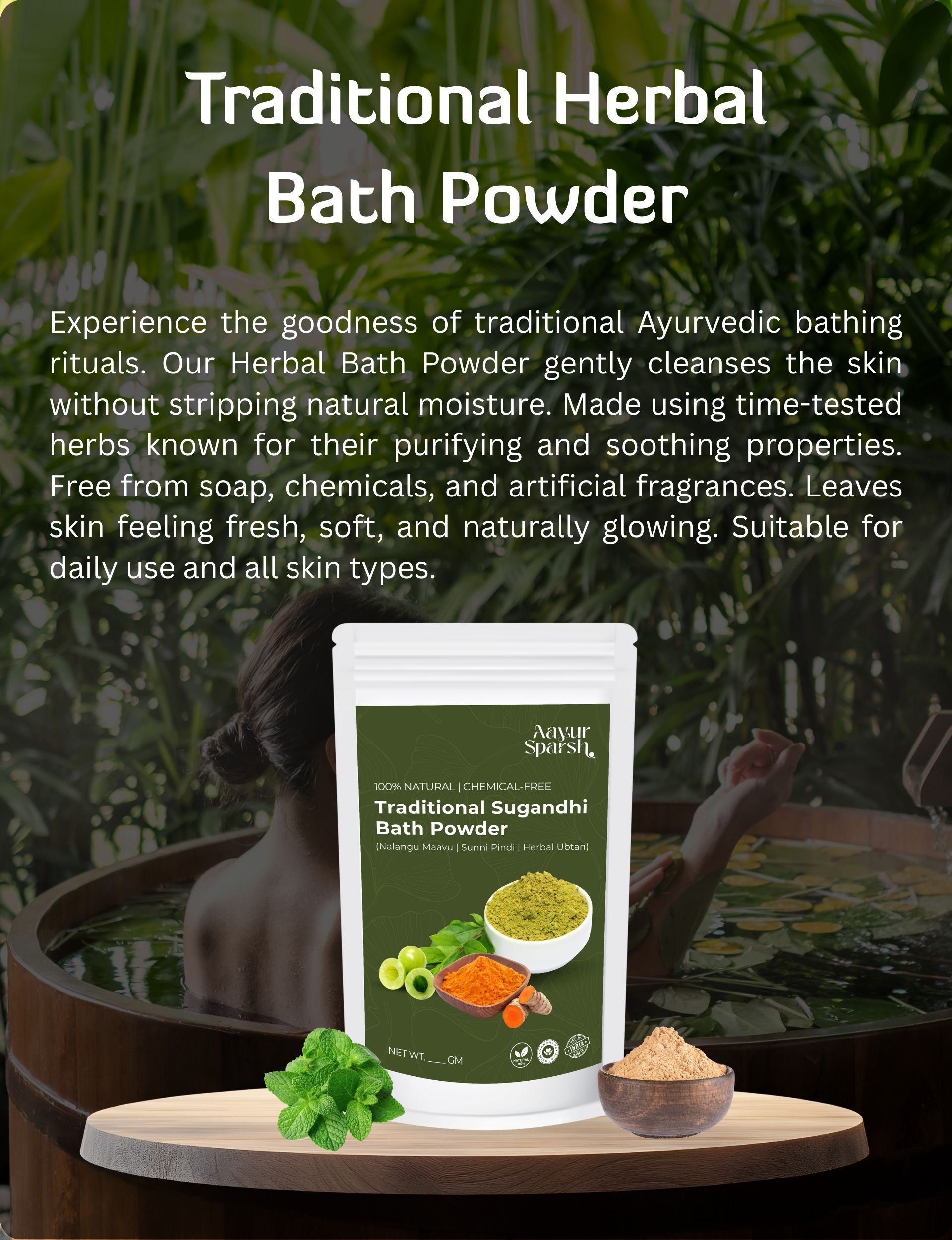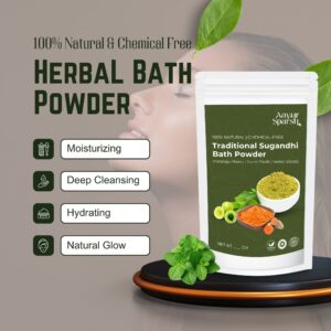 Bath PowderExperience the goodness of traditional Ayurvedic bathing rituals. Our Herbal Bath Powder gently cleanses the skin without stripping natural moisture. Made using time-tested herbs known for their purifying and soothing properties. Free from soap, chemicals, and artificial fragrances. Leaves skin feeling fresh, soft, and naturally glowing. Suitable for daily use and all skin types.