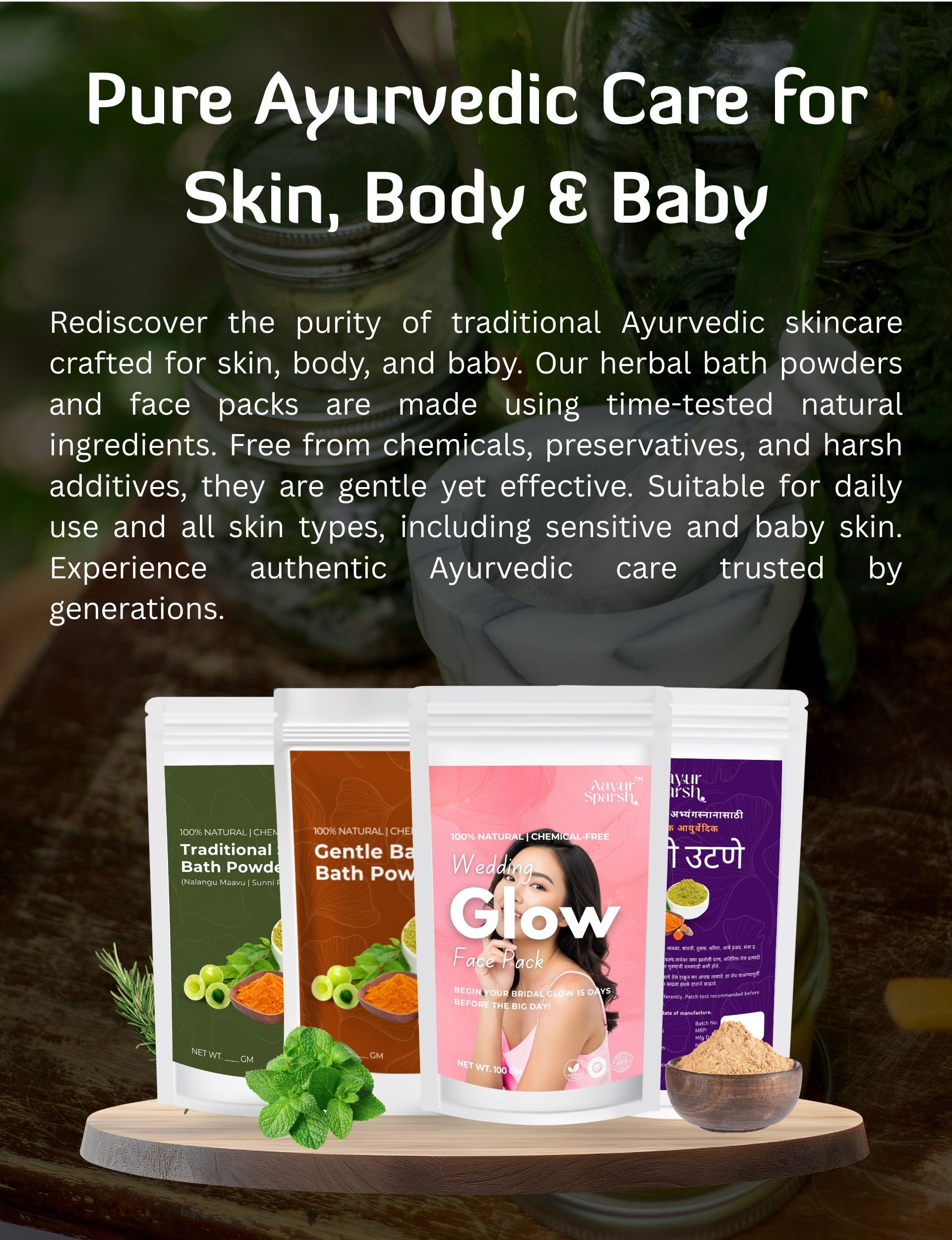 We believe skincare should be safe, effective, and suitable for every stage of life. That’s why AayurSparsh products are free from harsh chemicals, sulphates, parabens, and artificial additives. From baby bath powders to bridal glow face packs and festive ubtans, our range is crafted to support everyday self-care with honesty, purity, and trust—making Ayurveda a part of modern daily rituals.