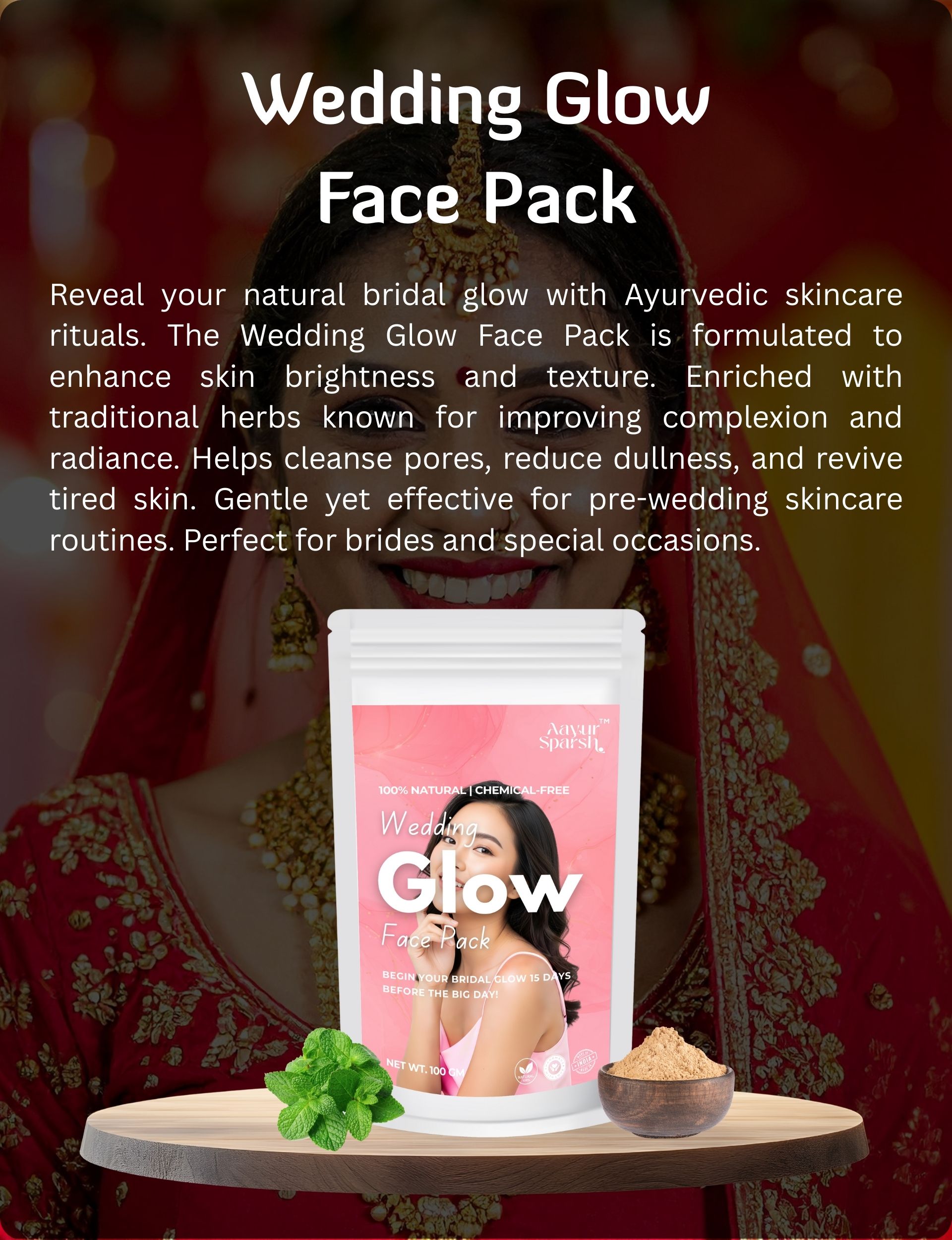 PackReveal your natural bridal glow with Ayurvedic skincare rituals. The Wedding Glow Face Pack is formulated to enhance skin brightness and texture. Enriched with traditional herbs known for improving complexion and radiance. Helps cleanse pores, reduce dullness, and revive tired skin. Gentle yet effective for pre-wedding skincare routines. Perfect for brides and special occasions.
